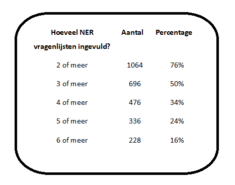 Als je besluit mee te doen aan het NER, vragen wij je het aanmeldformulier in te vullen. Zodra wij dit formulier hebben ontvangen, sturen we je via e-mail een uitnodiging om een online vragenlijst in te vullen. In het figuur hiernaast kan je zien hoeveel mensen onze vragenlijsten al hebben ingevuld.